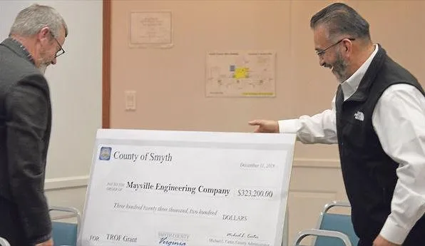 Smyth County Board of Supervisors Chairman Todd Dishner, left, and Frank Castanon, Vice President of Operations Tanks for MEC, celebrated the Tobacco Commission grant that the company received based on its local investments and employment.